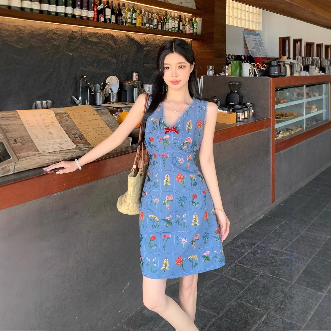 大きいサイズの婦人服の春夏の新型の高級感の花の刺繍vネックの袖なしで腰を収めてやせているワンピースを現します。