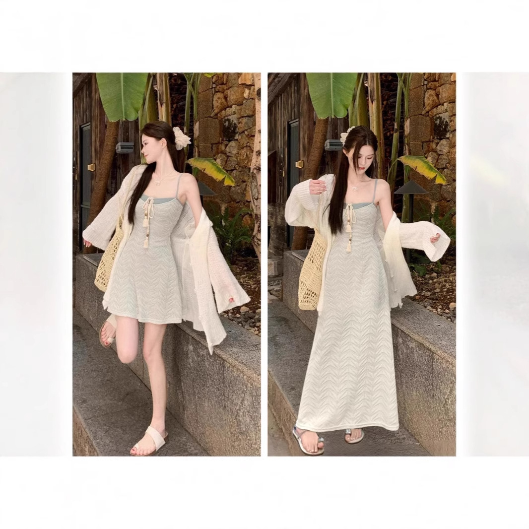 大きいサイズの甘美な網の糸はひもをつないで腰が高くてやせているガーターのワンピースのレースの日焼け止めのカーディガンを現します。