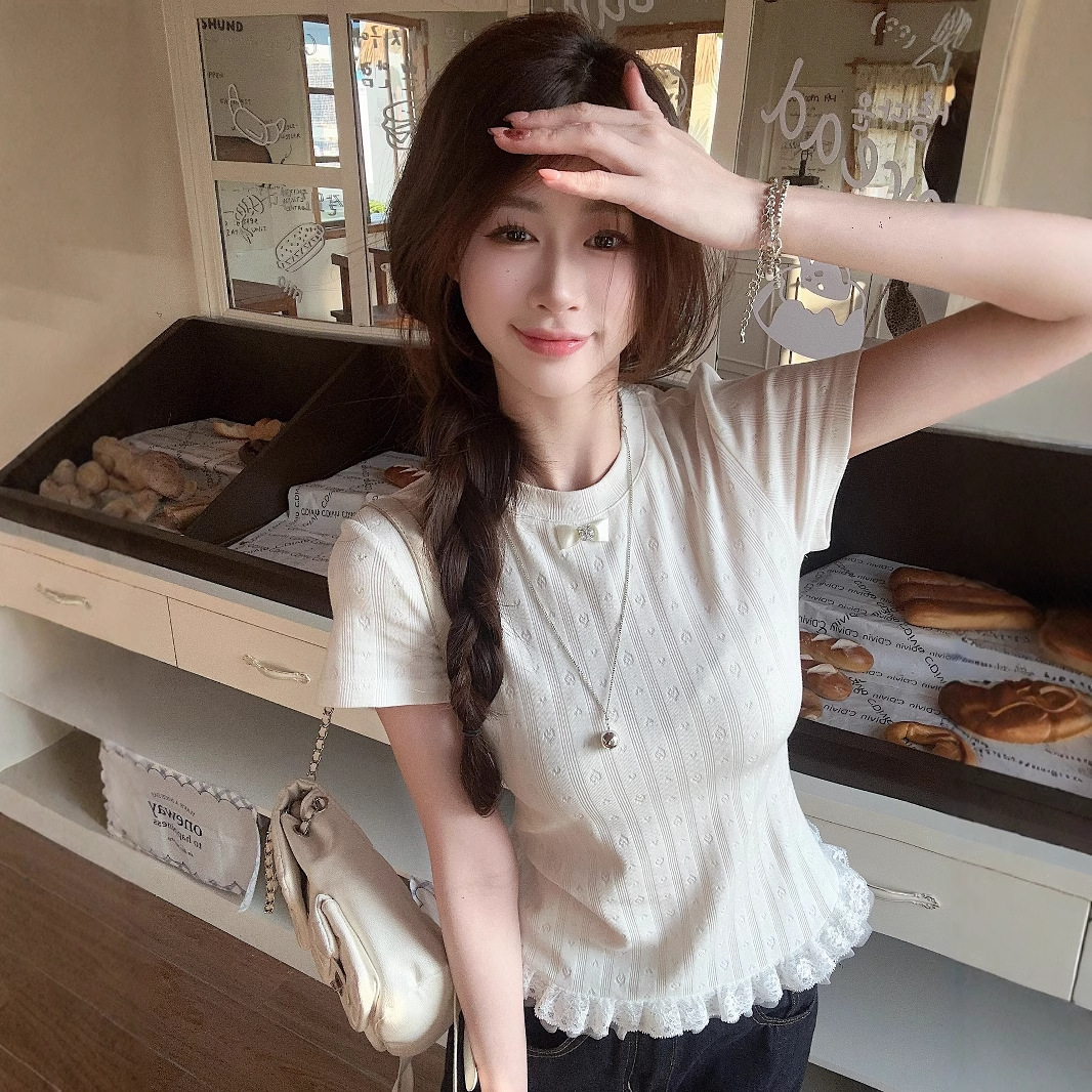 大きいサイズの甘いレースは半袖のニットの女性の夏の年齢を減らします。