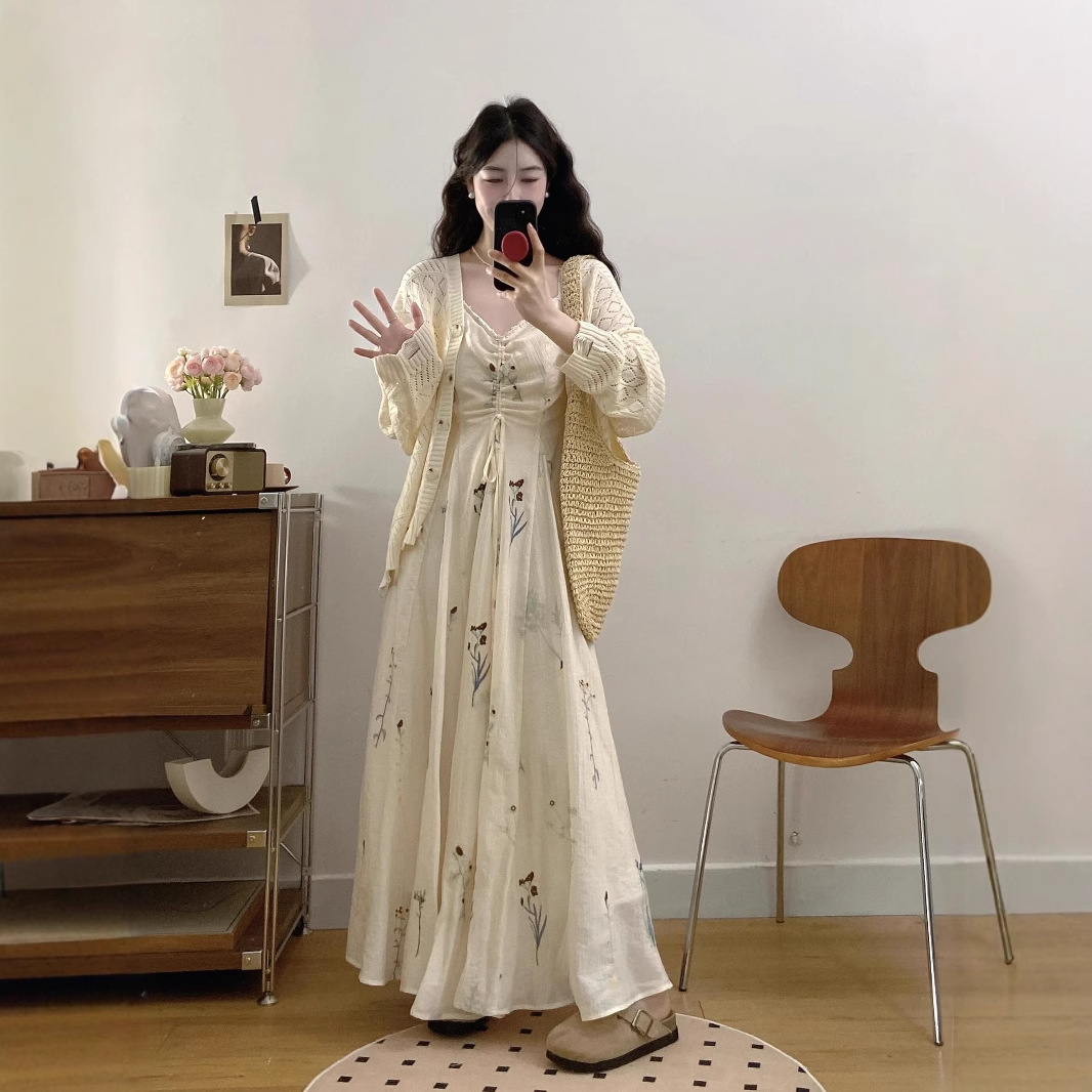 大きいサイズ南枝杏調フランス風気質ワンピース女性しわ感水草花レトロ刺繍ロングスカート