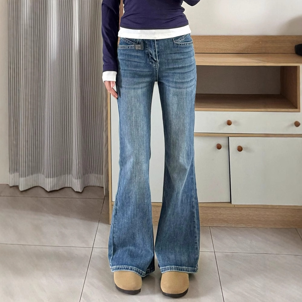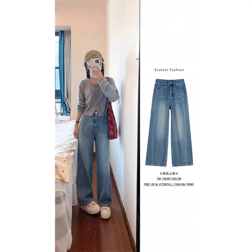 大きいサイズの香港風の水洗いの青い広脚のジーパンの女性の春の金の高腰の狭い版はやせているストレートなズボンを現します。
