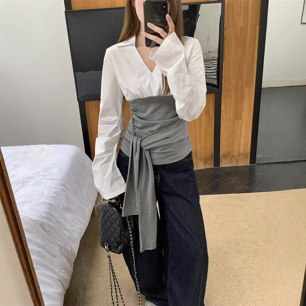 大きい女装はやせています。フランスのデザイン感は偽のvネックのシャツの長袖のtシャツの女性をつなぎ合わせます。