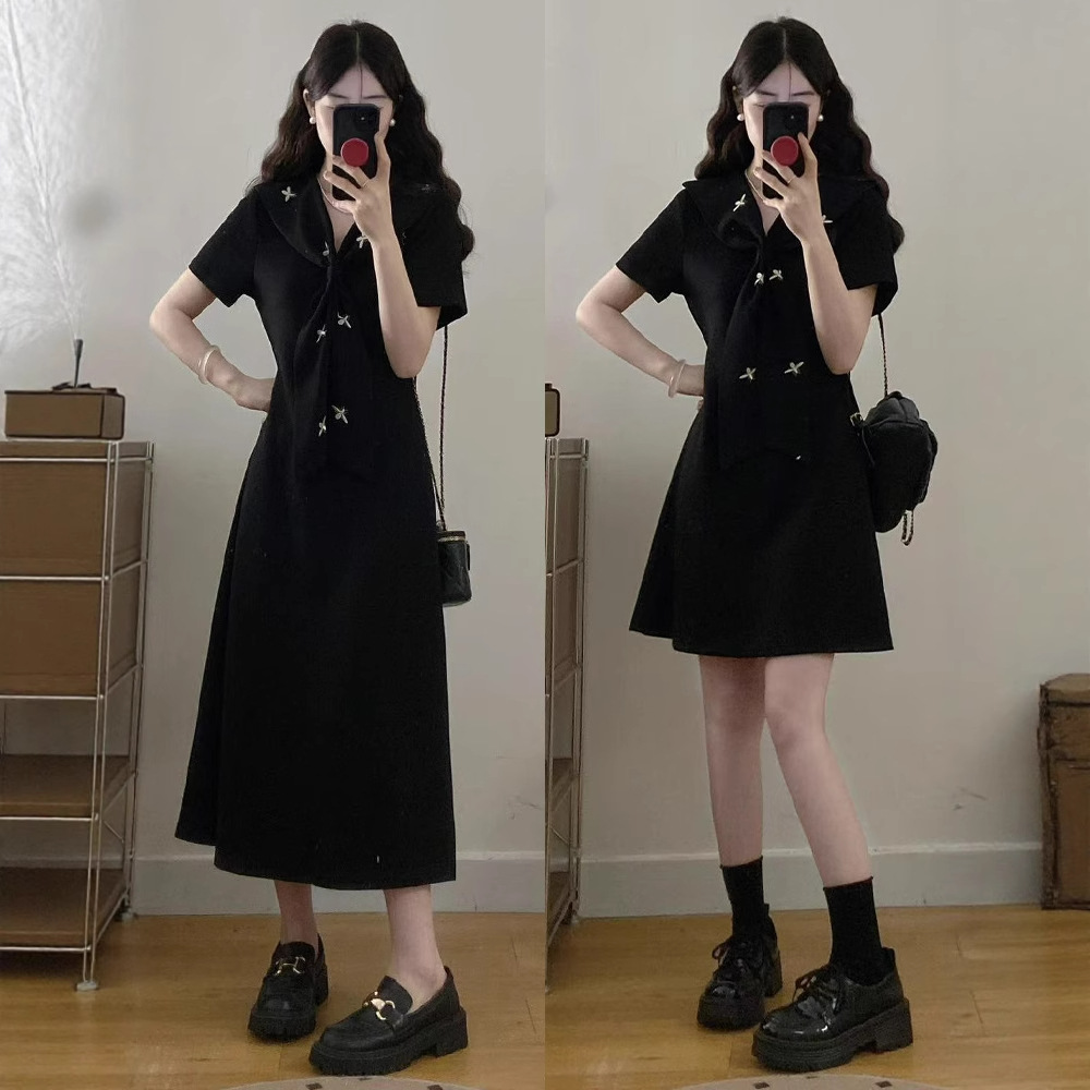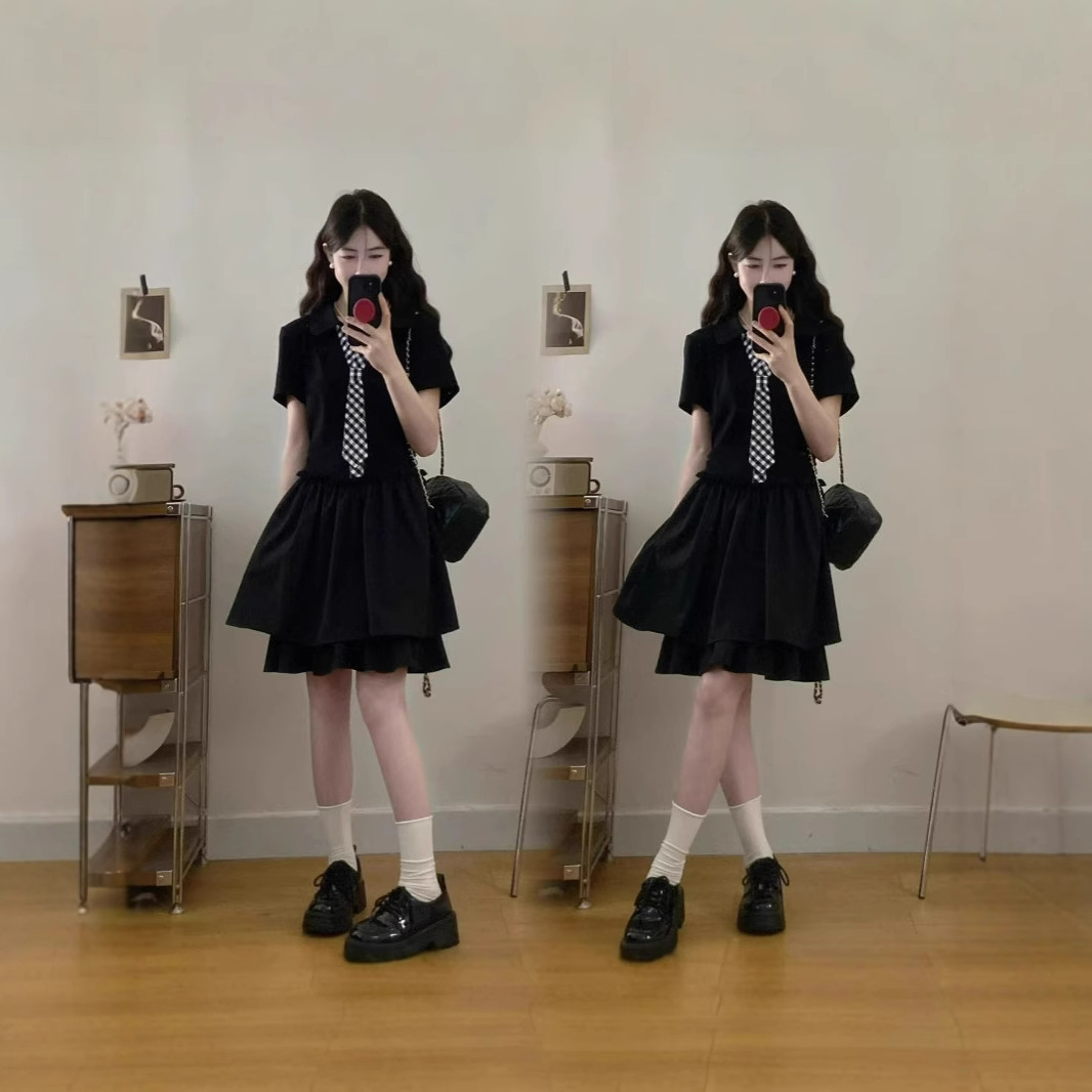 ファットMMプラスサイズブラックドレスレディースサマーカレッジスタイルパターンネクタイウエスト痩身リトルブラックドレス