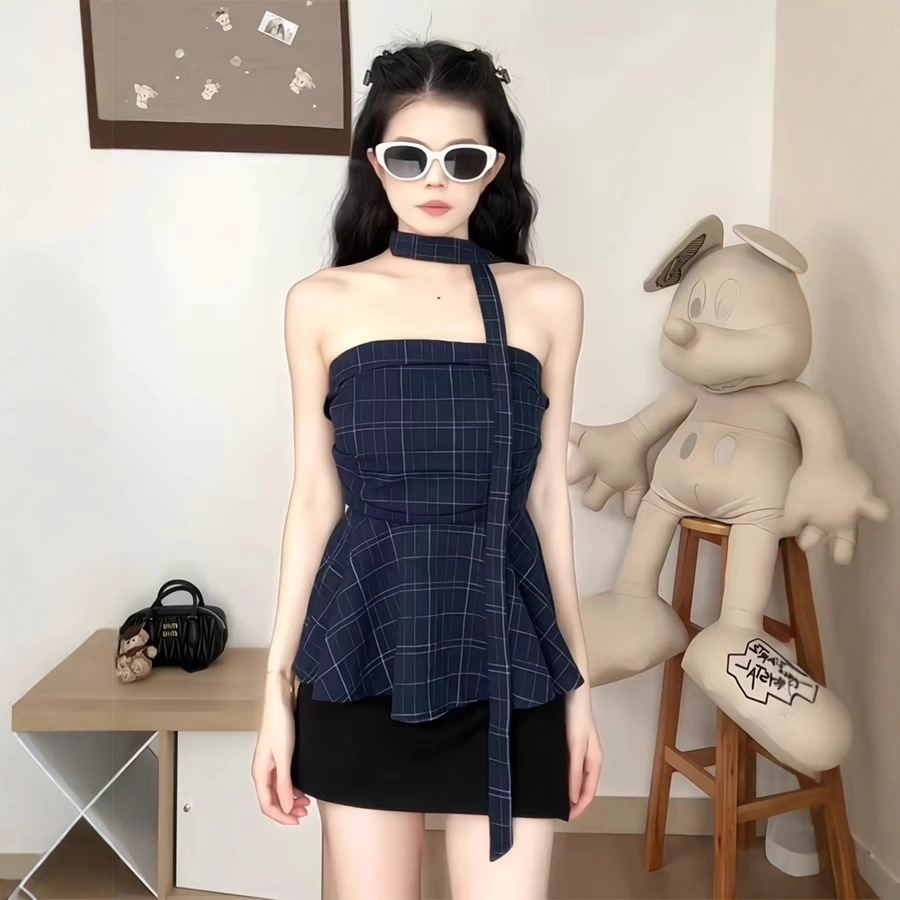 プラスサイズファットmmアメリカンレトロチェック柄コントラストカラーチューブトップ夏の新しいファッションハイエンドホットガールトップ女性用
