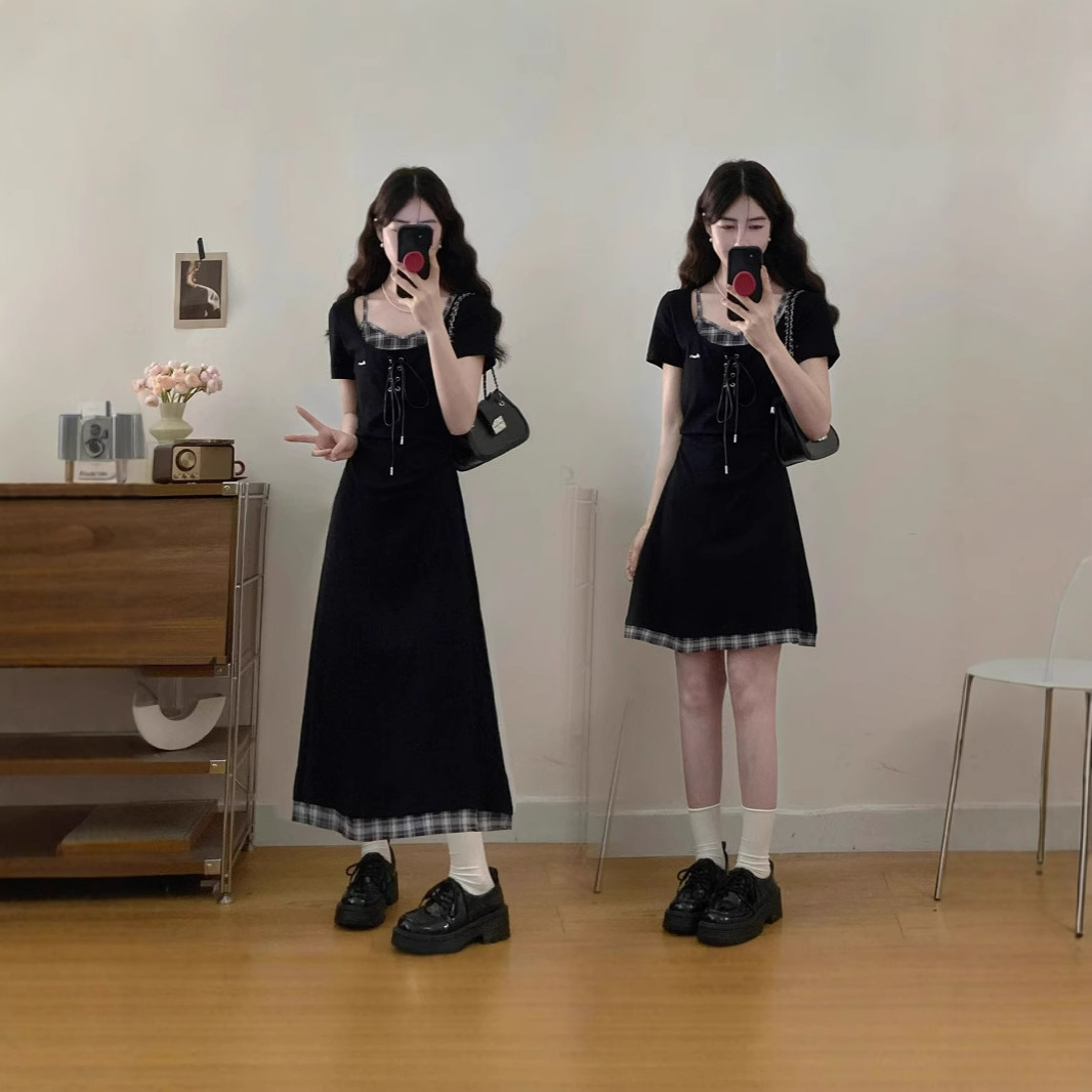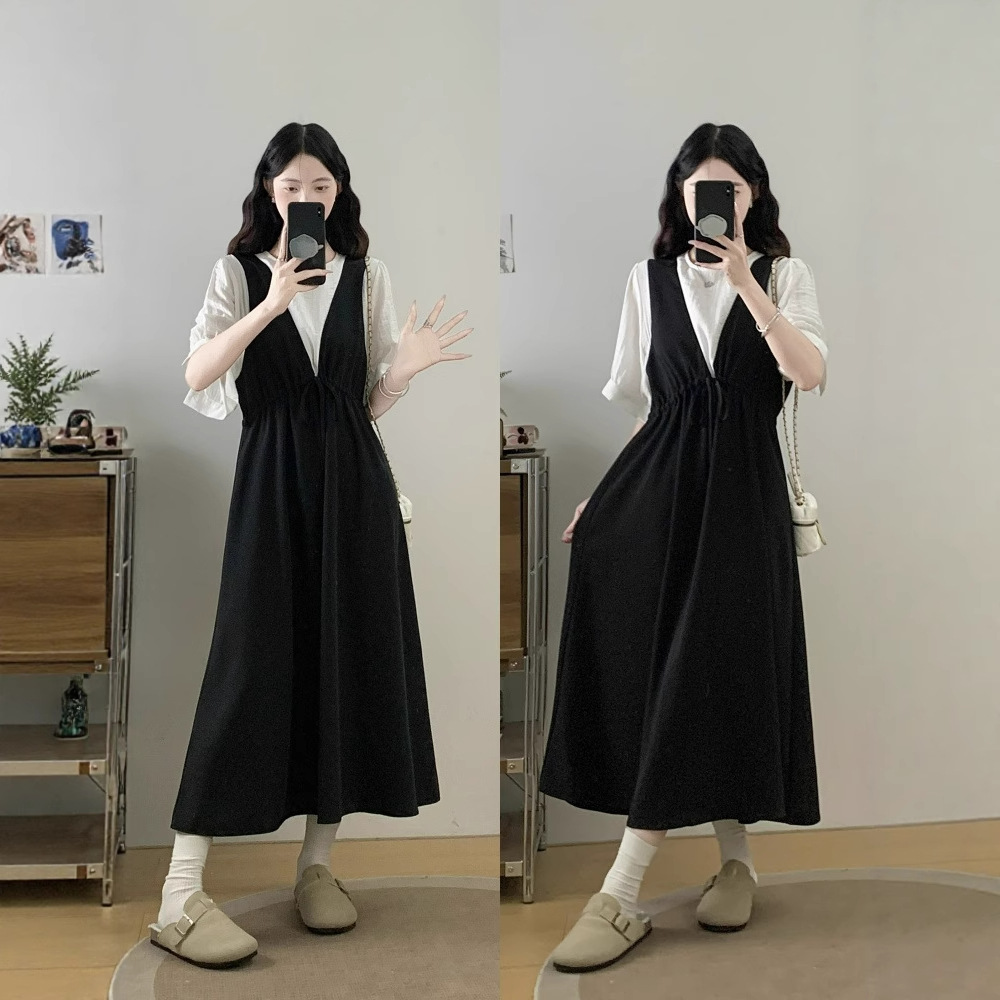 プラスサイズの女性の巾着黒と白のカラーブロックフェイクツーピース韓国ドレスファットMMウエスト痩身サスペンダー半袖スカート