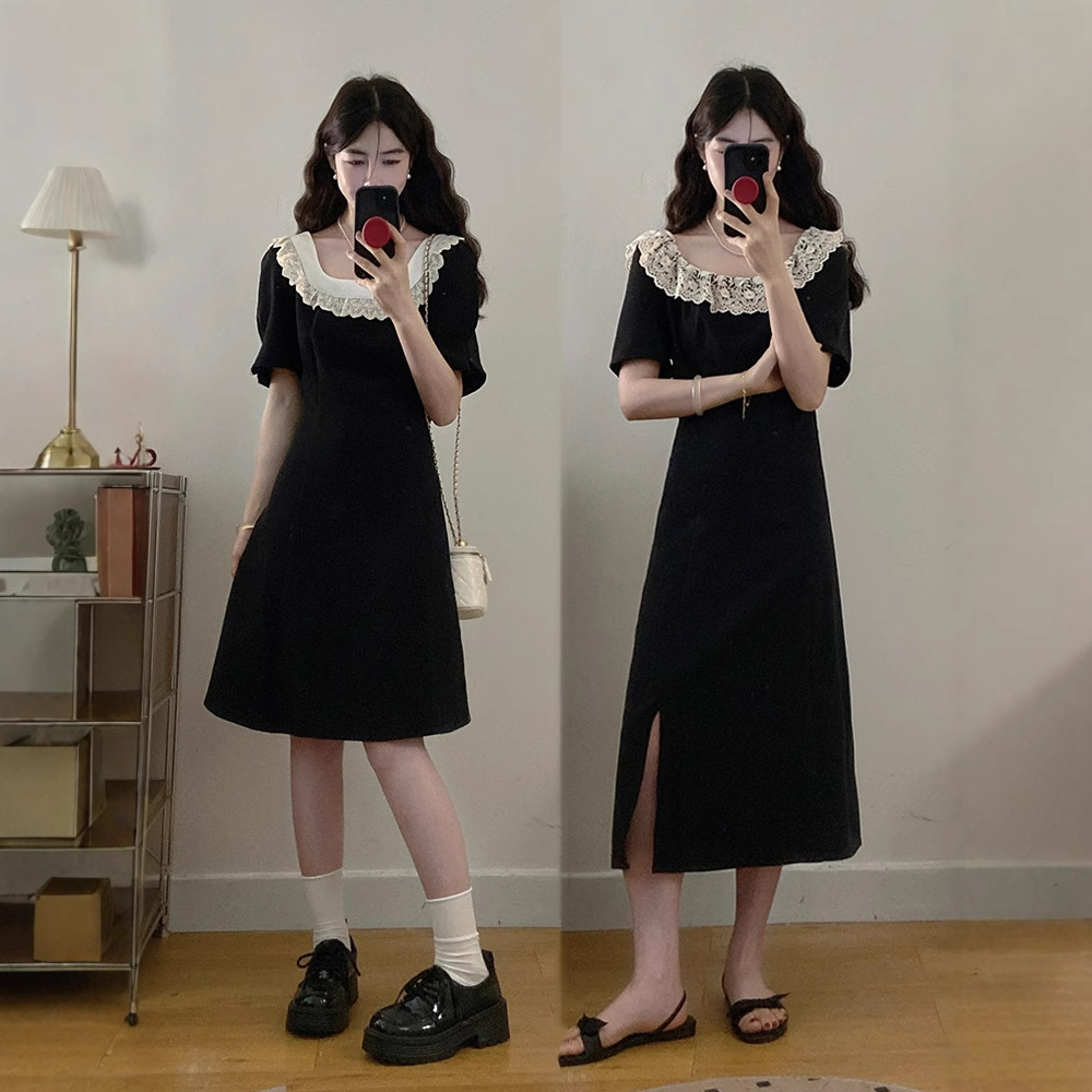 プラスサイズの女性のファッションレースレース襟リトルブラックドレスヘップバーンスタイルハイウエストミディドレス