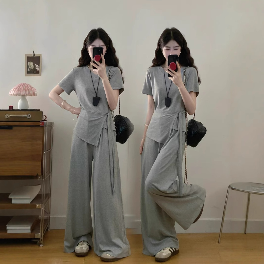 大きいサイズのウエスト痩身半袖トップとハイウエストワイドレッグパンツ女性のための 2025 夏の新しいファッションカジュアルツーピーススーツ