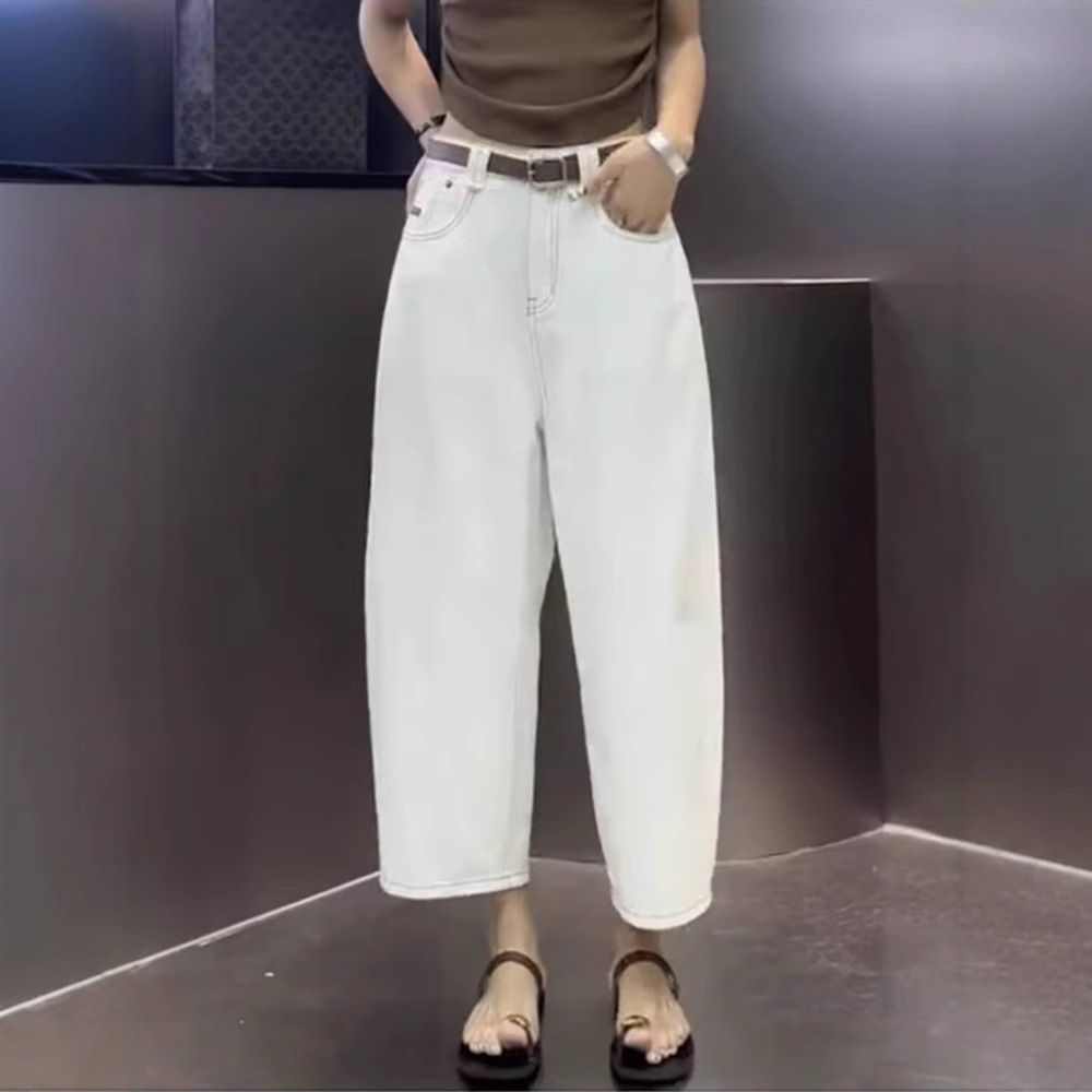プラスサイズの女性の白いハイウエストワイドレッグジーンズ女性の夏薄い痩身 9 点お父さん