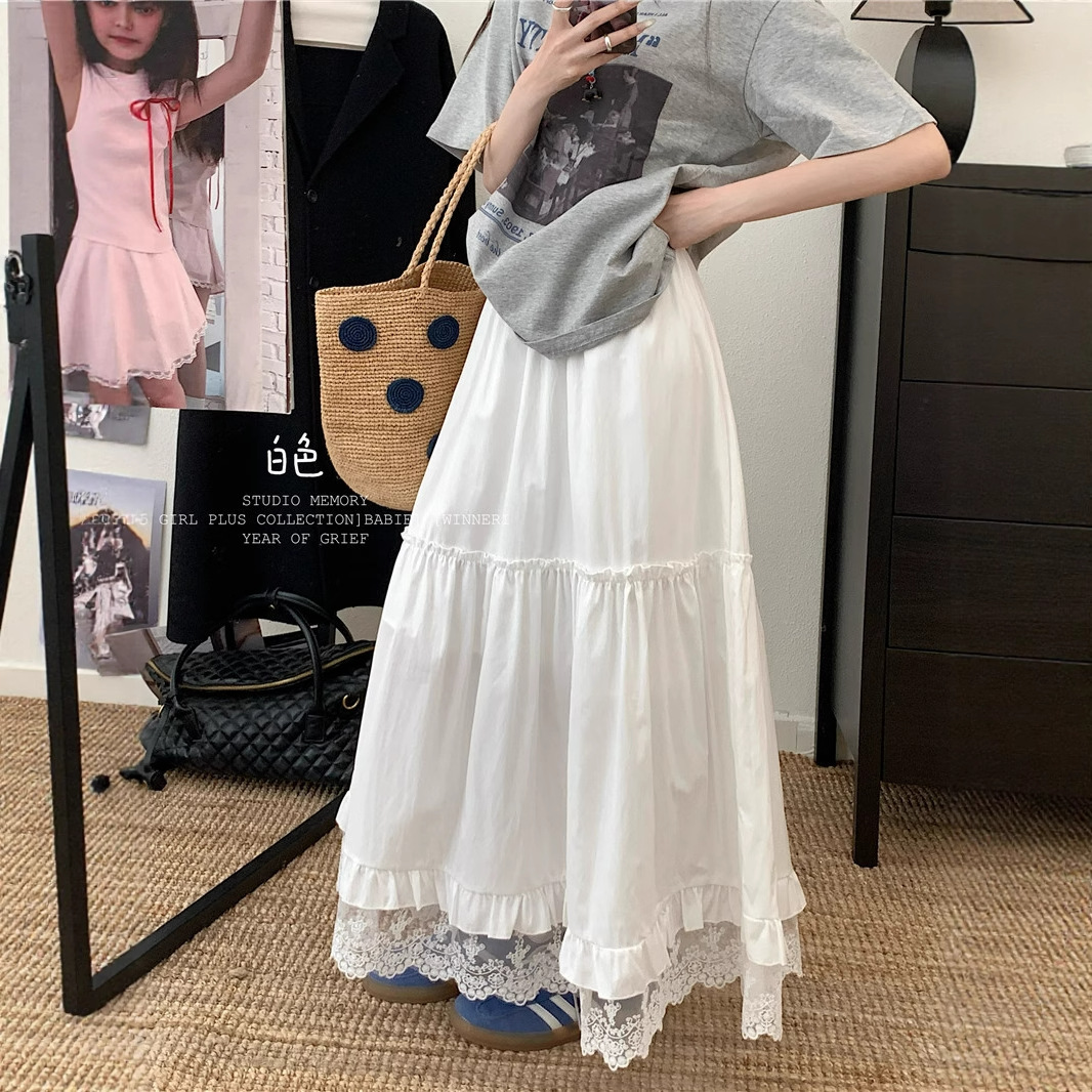 プラスサイズの女性の 2025 甘いスタイルのレーススプライシングスカート春は股をカバーし、スリムな A ラインのロングスカート