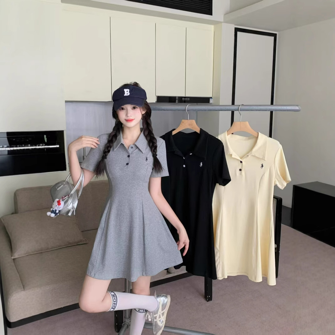 2025 プラスサイズの女性の夏の新しいポロカラー半袖ハイウエストスリムミドル丈ドレス