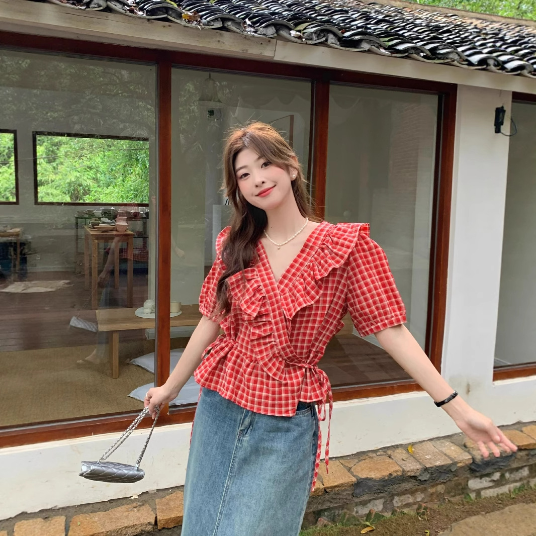 プラスサイズの女性の夏のトップス、ファッショナブルなフリルレースの赤いチェック柄のシャツ、年齢を減らし、痩身シャツ