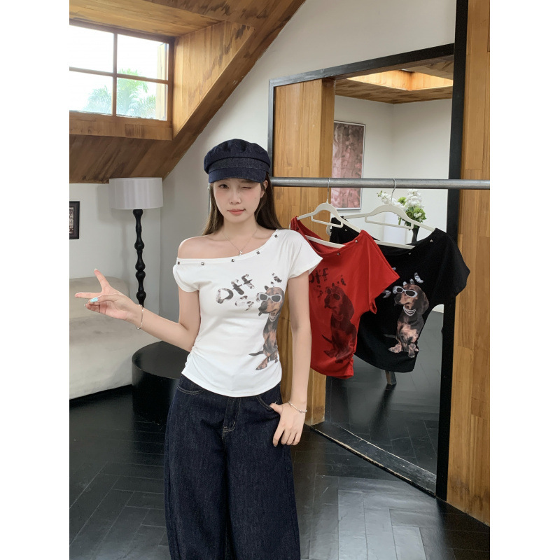 プラスサイズファットMMアメリカンレトロ子犬プリント斜め肩半袖Tシャツスリムフィットプリーツウエストトップ