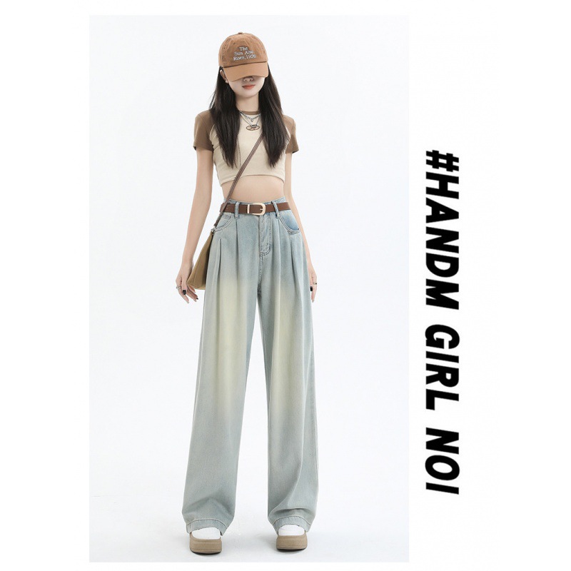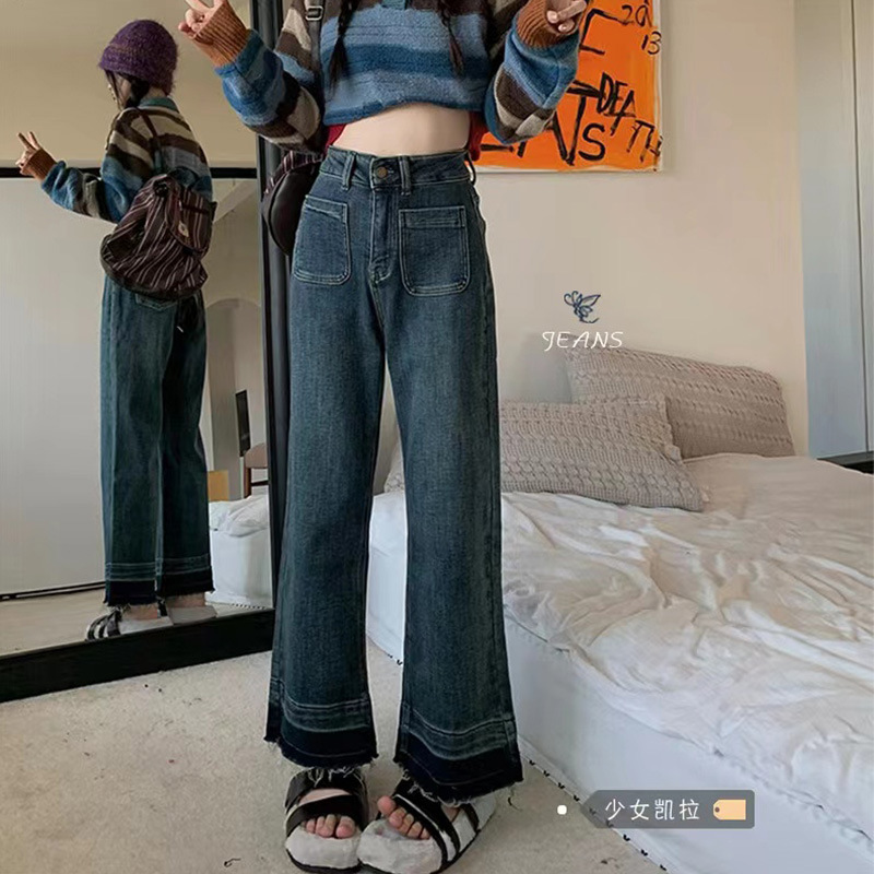 レトロなビッグサイズの高腰広脚ジーンズ女性春秋デザイン感リンゴ型スタイルはストレートで痩せたズボンを着ている