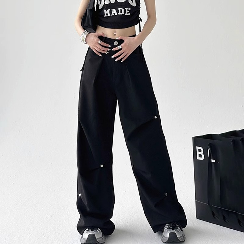 黒い工装ズボンの大きいサイズの女性梨型の体が太っています。