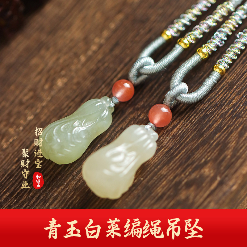 Xirui 天然ホータン翡翠サファイアペンダント彫刻百財ラッキーキャベツ編組ロープネックレス縁起の良いペンダントセーターチェーン
