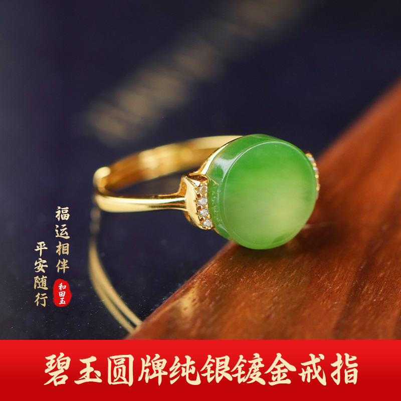 熹瑞天然和田碧玉円牌925純銀金メッキ指輪新中国式食指戒シンプル開口女戒