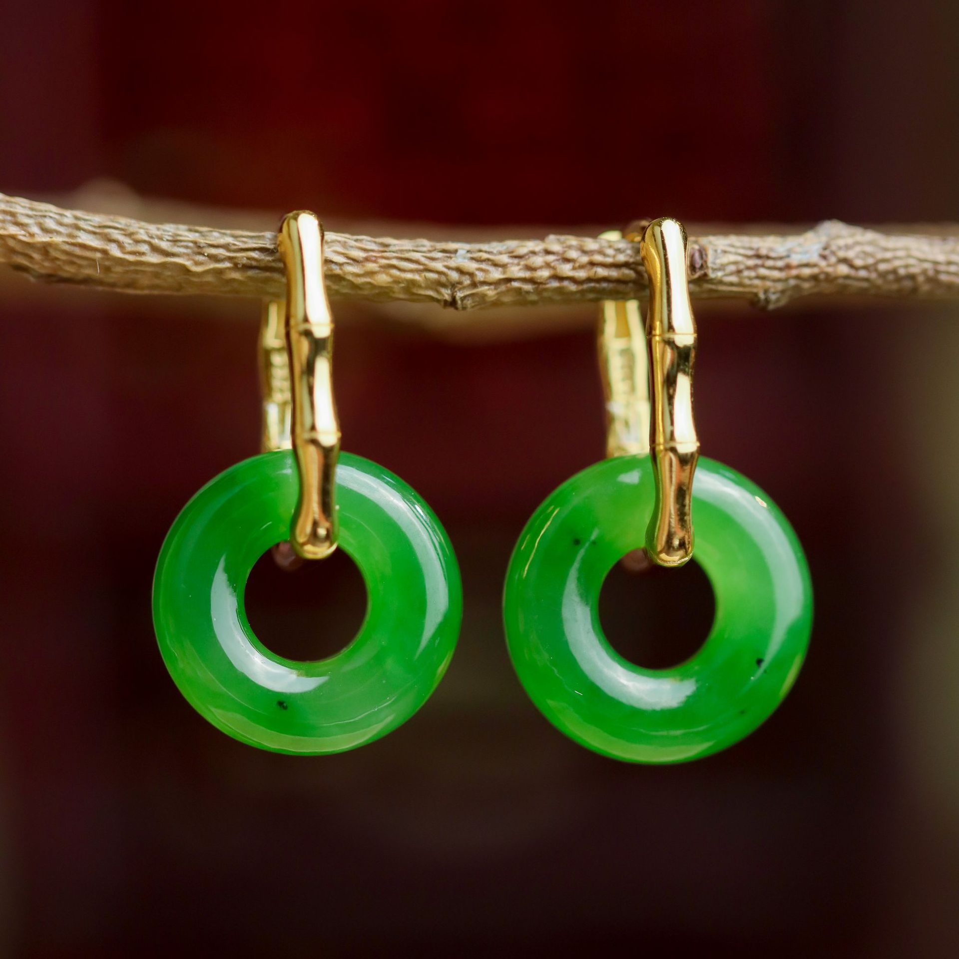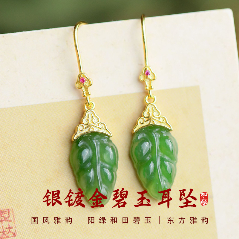 熹瑞s925銀金メッキ碧玉イヤリング陽緑と田玉葉耳フック国風気質卸売り耳飾り