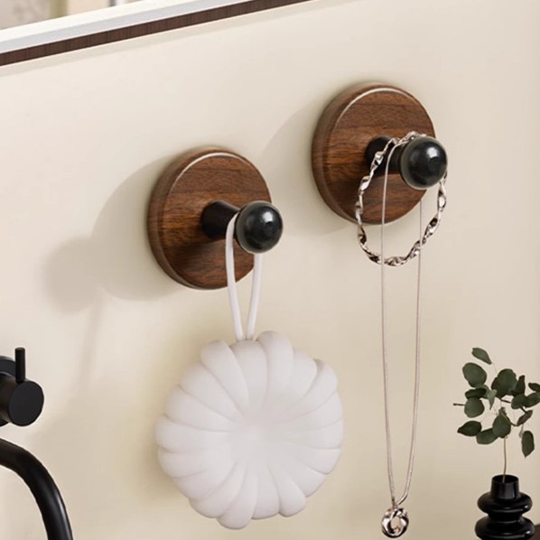 真空吸盤フック、穴あけ不要、木製、強力な耐荷重、痕跡のないミッドセンチュリースタイルのウォールナットカラー粘着フック
