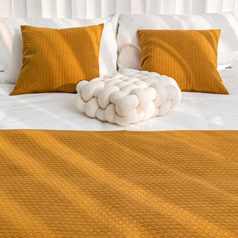 現代のシンプルなサンプルプレートの部屋のベッド用品の黄色のエンボスのベッド旗の抱き枕の組み合わせのホテルの民宿のベッドの尾のタオルはじゅうたんを掛けて枕に寄りかかります。