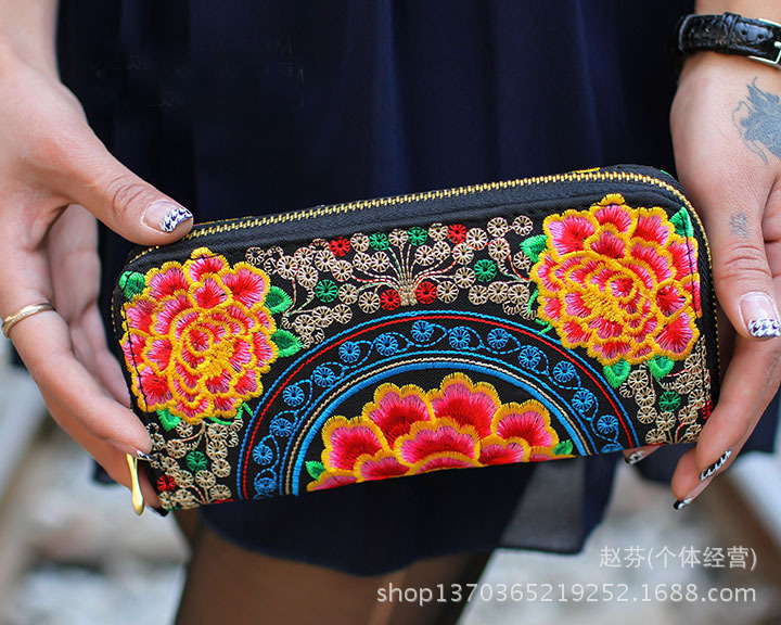 新商品の中国風半月花輪の長いお金は苗を挟んで民族風の財布の女性の金を刺繍します。
