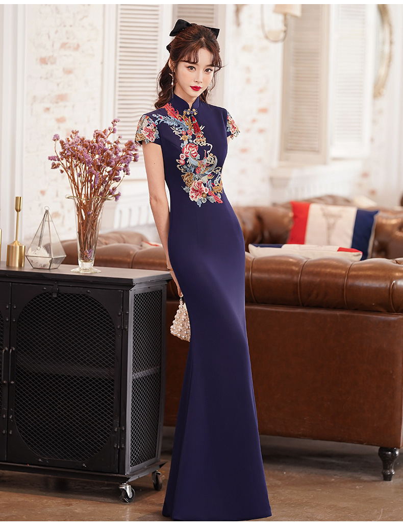 ショーの刺繍のチャイナドレスの秋の2022年の新型の優雅な気質の修身の若いタイプのショーの長いチャイナドレスの公演服