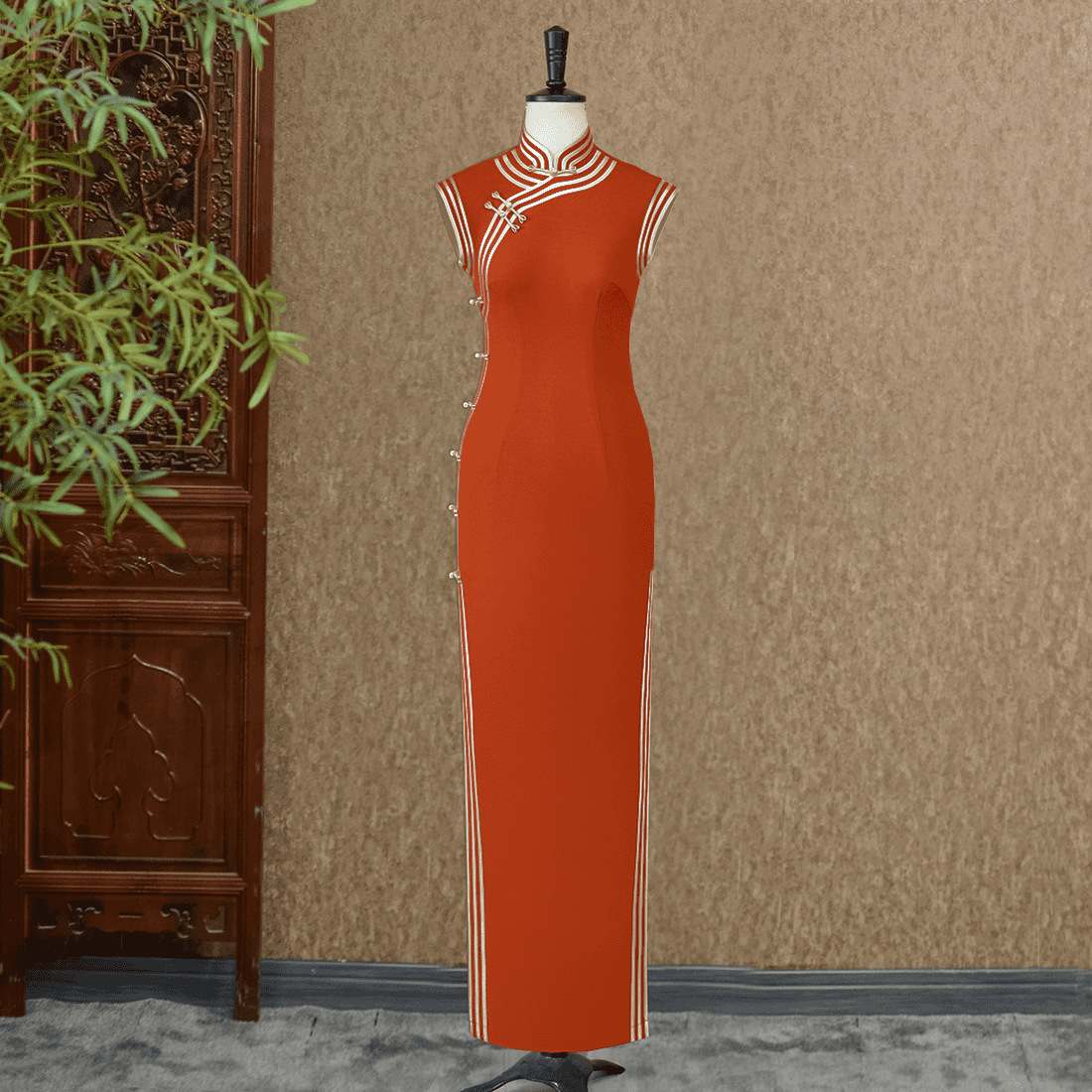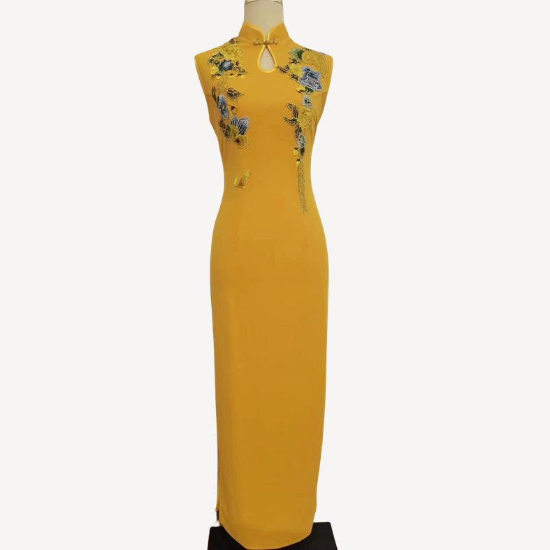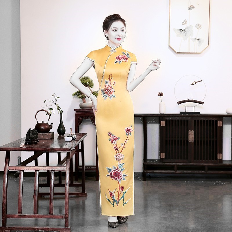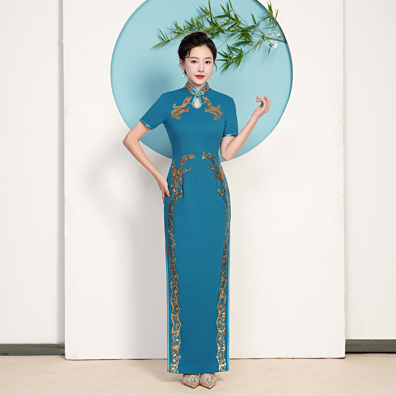 2020年春夏新作ロングチャイナドレス、おしゃれな中高年向け舞台衣装、キャットウォーク、宴会、式典用チャイナドレス