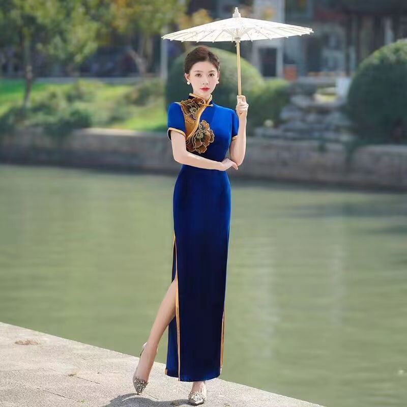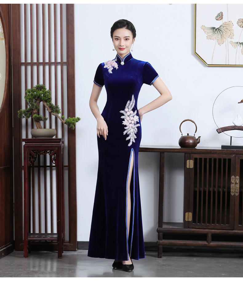 ベルベットのチャイナドレス2023年の新しい刺繍の長いタイプのレトロで優雅な高開フォークはショーのチャイナドレスを改良して秋の色を分けた