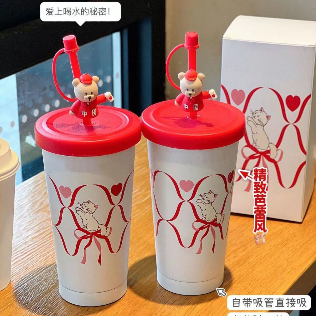 星のお父さんの同じタイプのかわいいニャンコの赤い蝶結びのストローカップの保温カップの304ステンレスの大容量のコップ