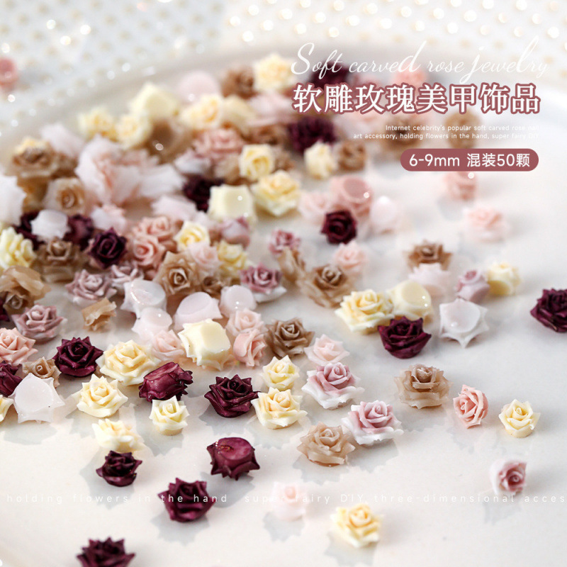 卸売混合ソフトローズネイルアートジュエリー人気の樹脂汚れ花絶妙な甘い花ネイルジュエリー
