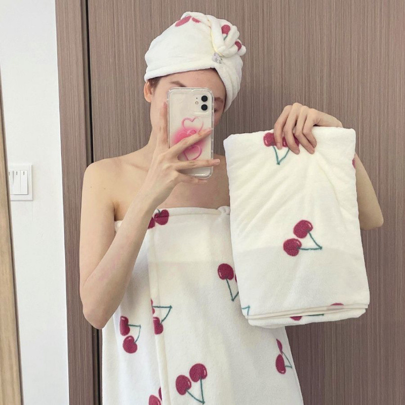 インス風かわいいチェリーバスタオル女性ネットセレブバススカートタオルドライヘアキャップセット吸水速乾学生ラップ