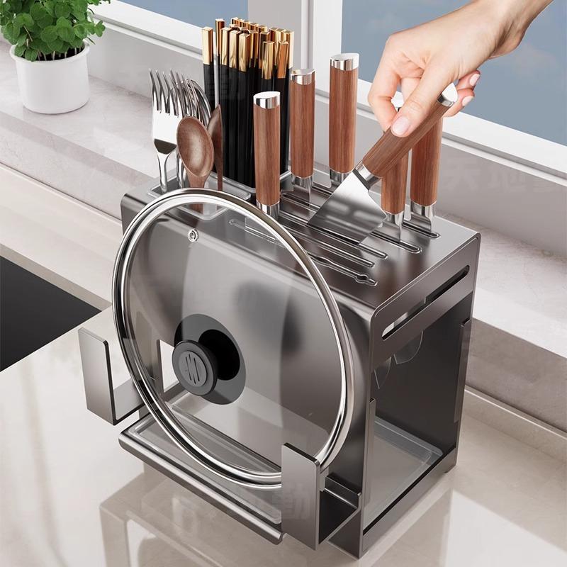 2025新型キッチンナイフホルダー野菜プレート鍋蓋棚ステンレス多機能箸籠一体収納棚