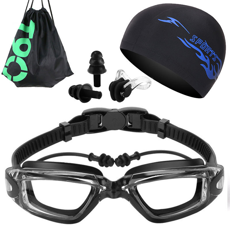 水泳メガネ HD 防水防曇水泳ゴーグル大人子供男性女性大型フレーム耳栓付きフラット近視オプション