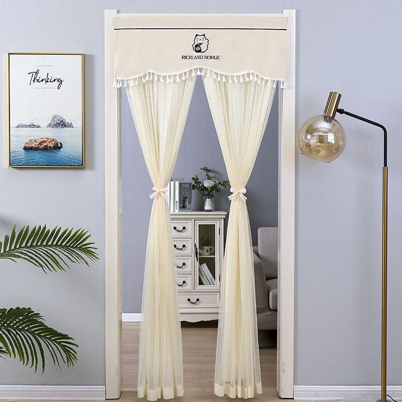 ドアカーテン 2 層、パンチングなしの伸縮ロッド、家庭用オールシーズン寝室の布カバー、防蚊、露出防止ガーゼカーテン