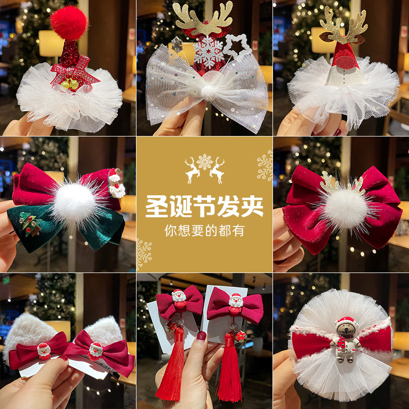 レースのクリスマスの帽子の髪飾りの髪は前髪の縁を挟んで蝶結びのクリスマスのヘラジカの髪を挟みます。