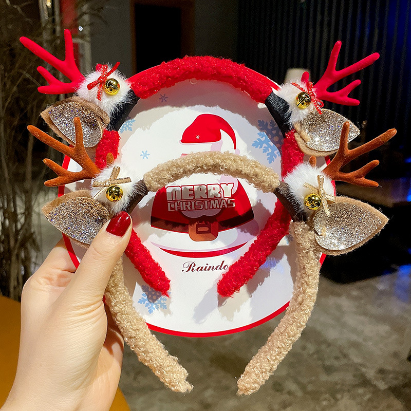 赤い鈴ヘラジカの頭のカチューシャの祝日の装いの髪飾り2023年の新型のサンゴの鹿の角のカチューシャの髪飾り