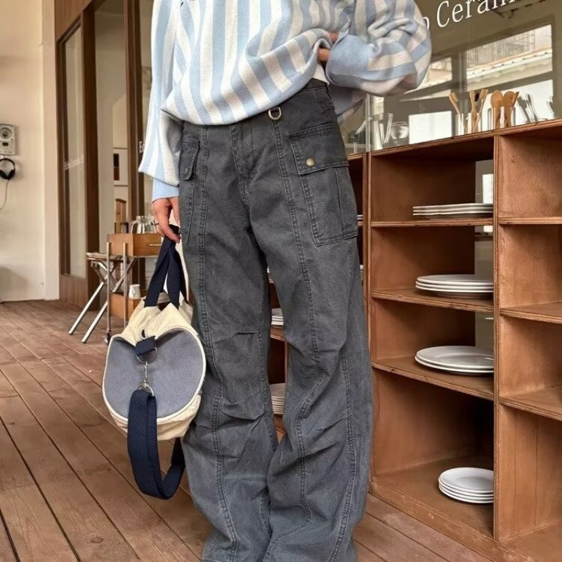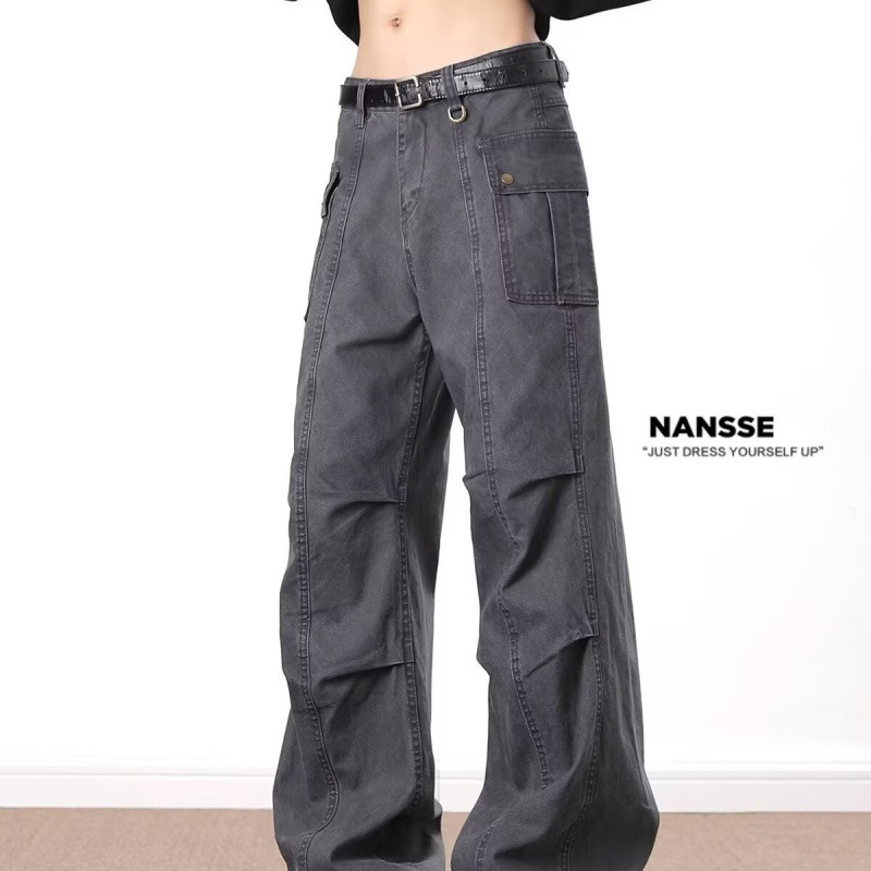 アメリカのレトロな古い灰色のしわの多いポケットのズボンの男性の高級感のストレートな筒の小さいラッパはやせているカジュアルなズボンを現します。
