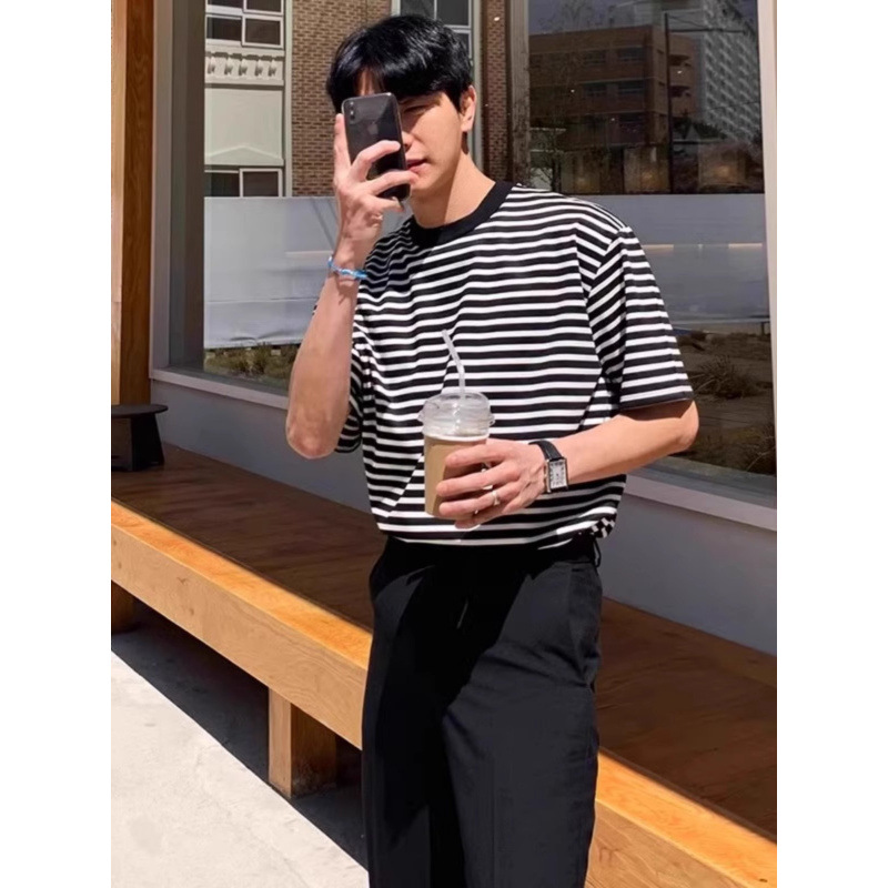 潮牌の潮流の白黒のストライプの半袖のtシャツの男性の夏の新型の原宿の丸首の底のシャツのゆったりしている半袖のtシャツ