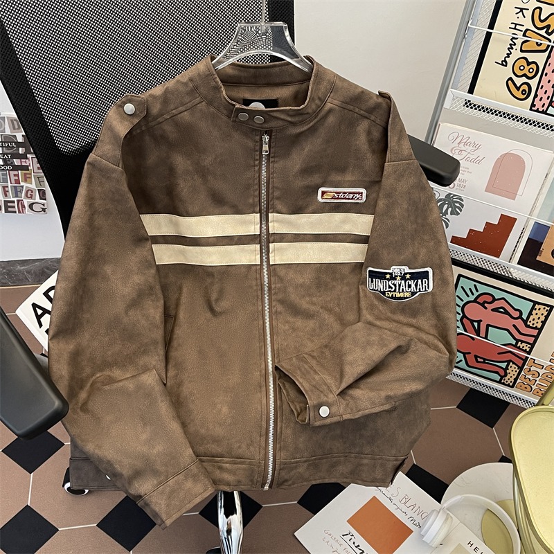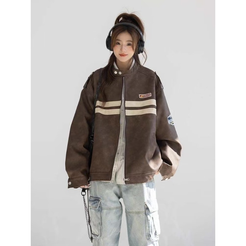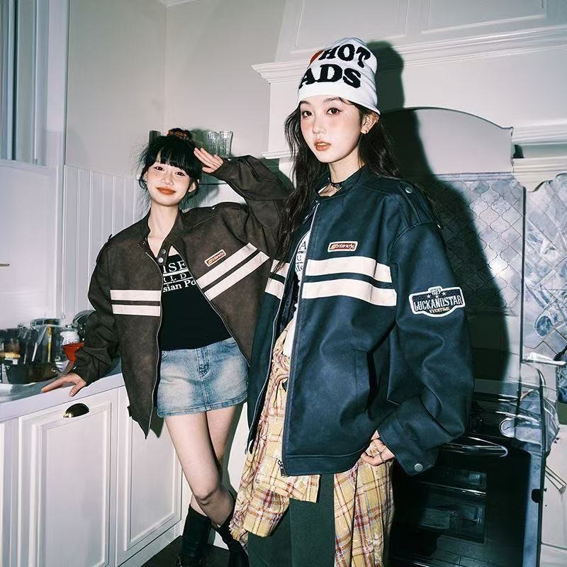 春秋のアメリカのストライプのジャケットのコートの機関車の服の男女の街頭のごろつきのハンサムな百合のカジュアルな衝突色のカップルの皮の服