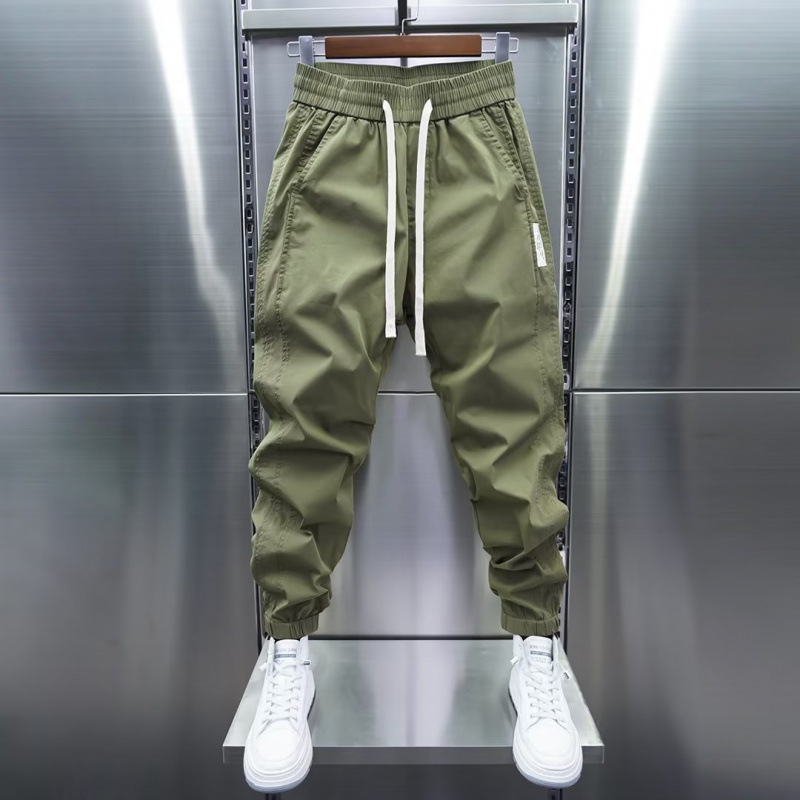 2025秋の新型純色カジュアルパンツは弾力性のある足のハーレムパンツをつなぎ合わせています。