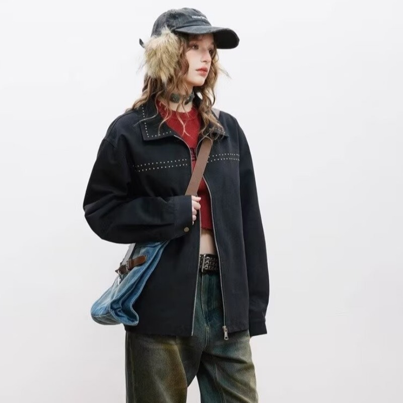 2025秋の新しい黒色ファッションアメリカのレトロな刺繍のゆるいカジュアルなファッションカードの襟のジャケットの女性