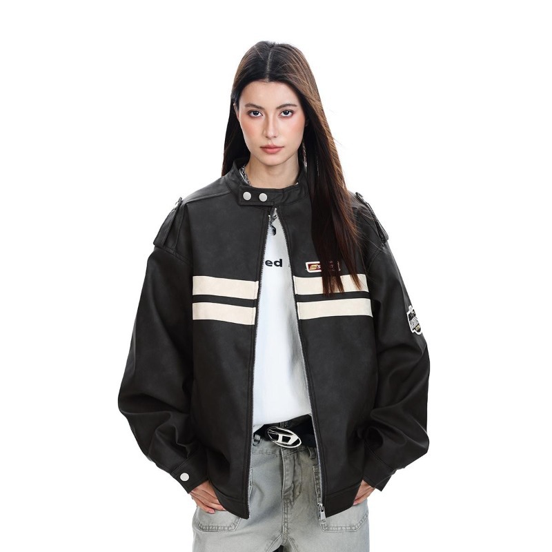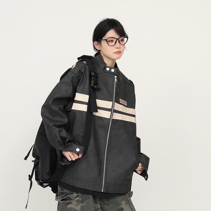 ヒップホップの美ラードのレトロな百合puの皮の服のコートの春と秋の街頭のゆったりしている長袖の上着はジャケットの潮をつなぎ合わせます。