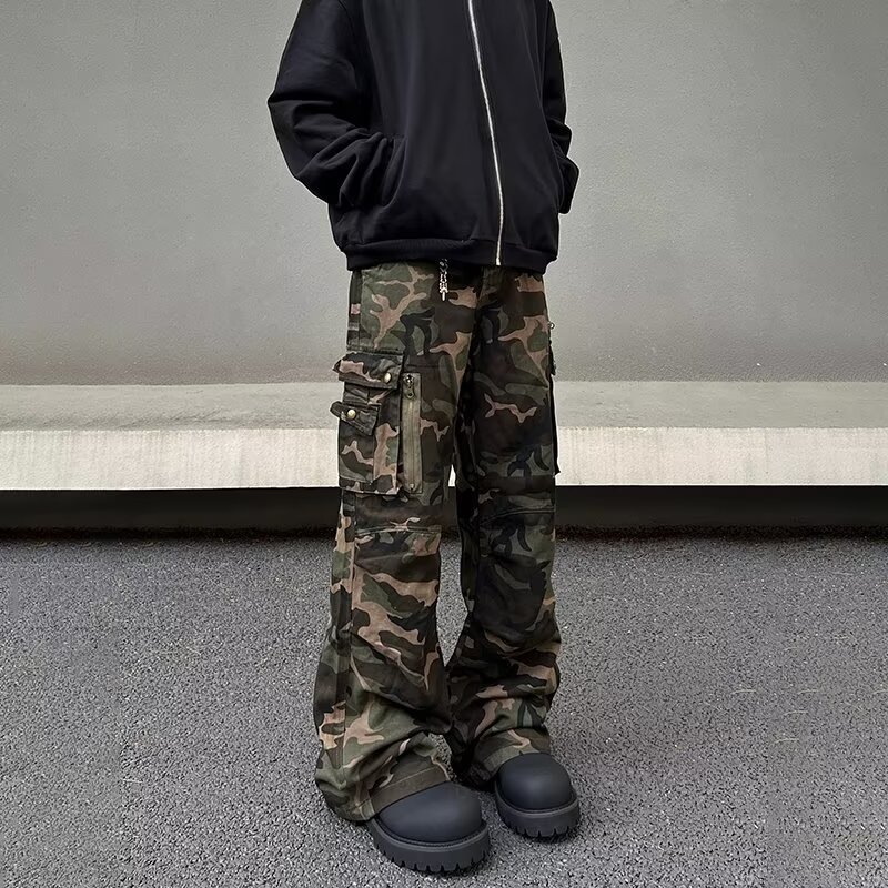 春と秋のアメリカのレトロな多ポケットの迷彩の工装のズボンの男性のゆったりしている高街の直筒のhiphopは地のズボンの潮を引きずっています。