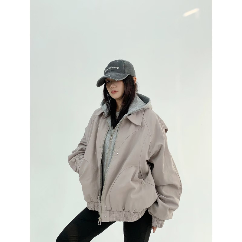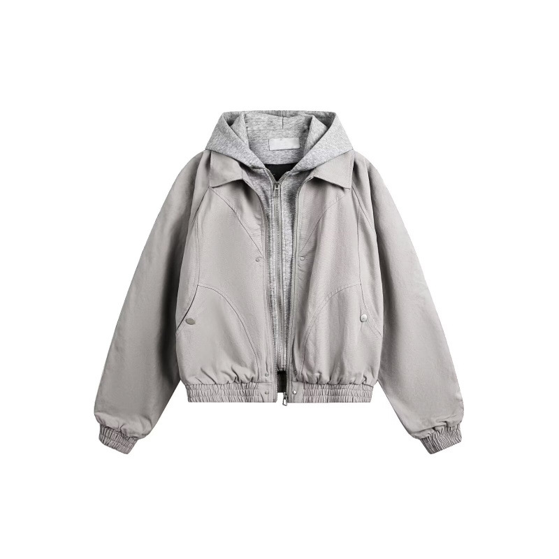 春秋のアメリカのレトロな青少年の郭の形のジャケットの男女のごろつきのかっこいい偽の2つのデザイン感は帽子のコートの潮に関連します。