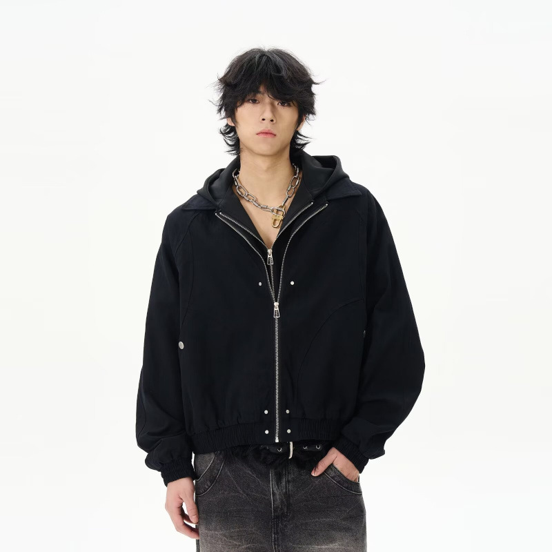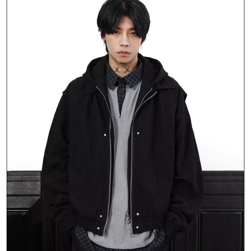 レトロな偽の2つのパッチングフードのスーツジャケットの男性モデル2025の新しい高街のデザイン感と帽子のコートins