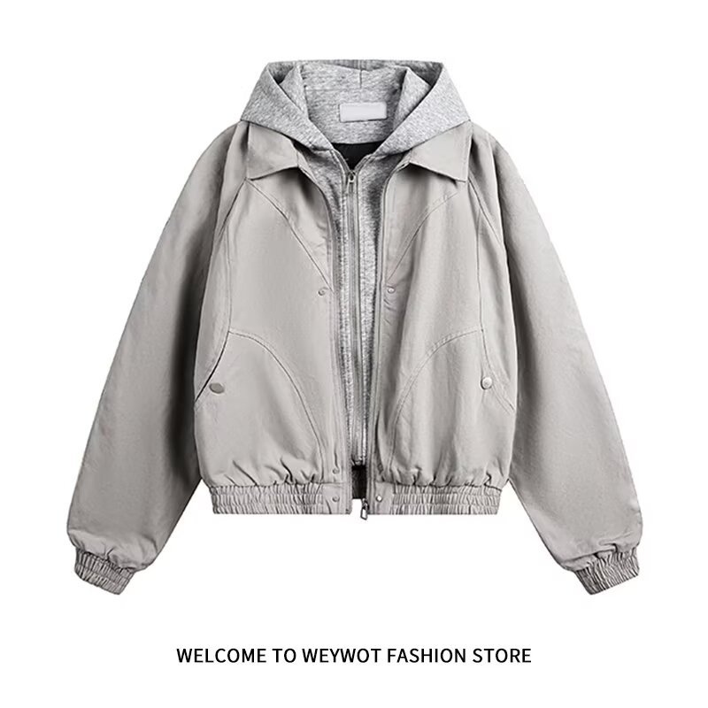 純色のアメリカ式の偽の2つのコートの女性2025年の朝の春の短いタイプの帽子の組み合わせの超美しい工装のジャケット