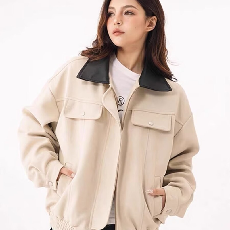 2025春の新型バーン風の襟をめくるスエードのコートの女性のアメリカの工装のゆったりしたジャケットの上着