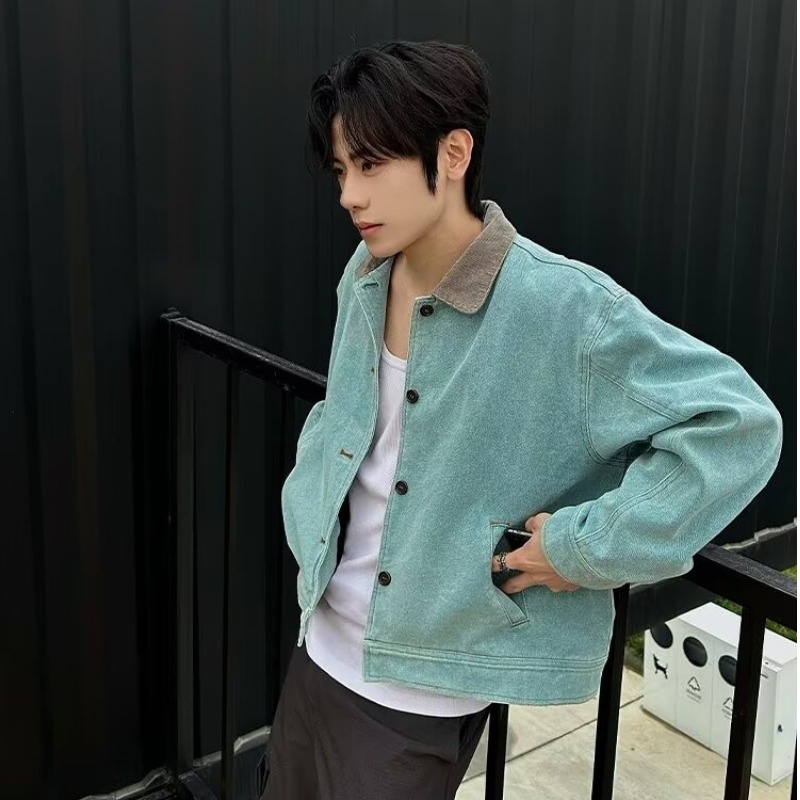純色の工装ジャケット男性春秋アメリカのレトロでゆったりしています。