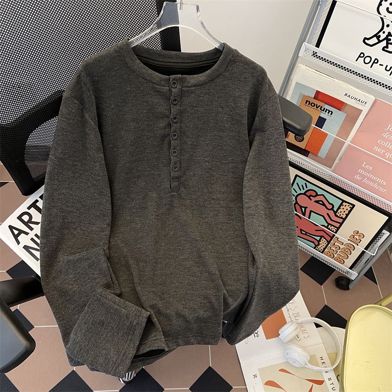 Cleanfitグレー長袖女性秋冬新作ヘンリー襟tシャツデザイン感インナーシャツゆったり上着