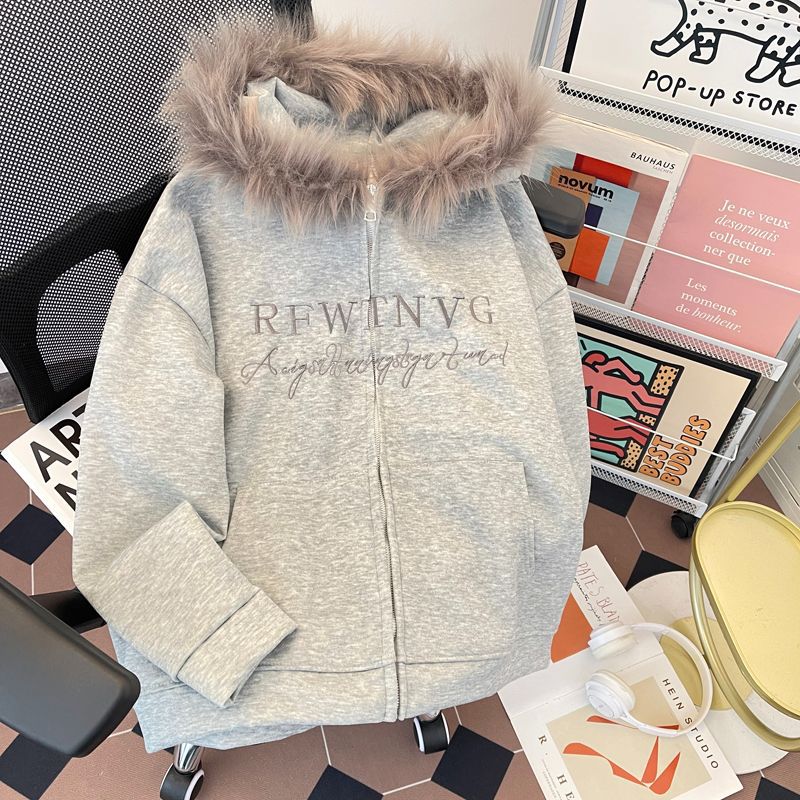 毛襟と帽子のカーディガン女性2024秋の新しいゆるいbfアメリカの街の怠惰なコート