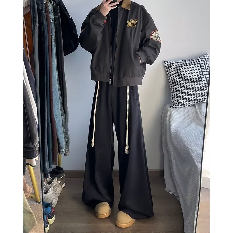 2024新型の大きいサイズのメンズヒップホップの手の太い縄の広い足の曲がった刀のズボンの男性の秋冬の垂感のゆったりしているカジュアルな衛のズボン